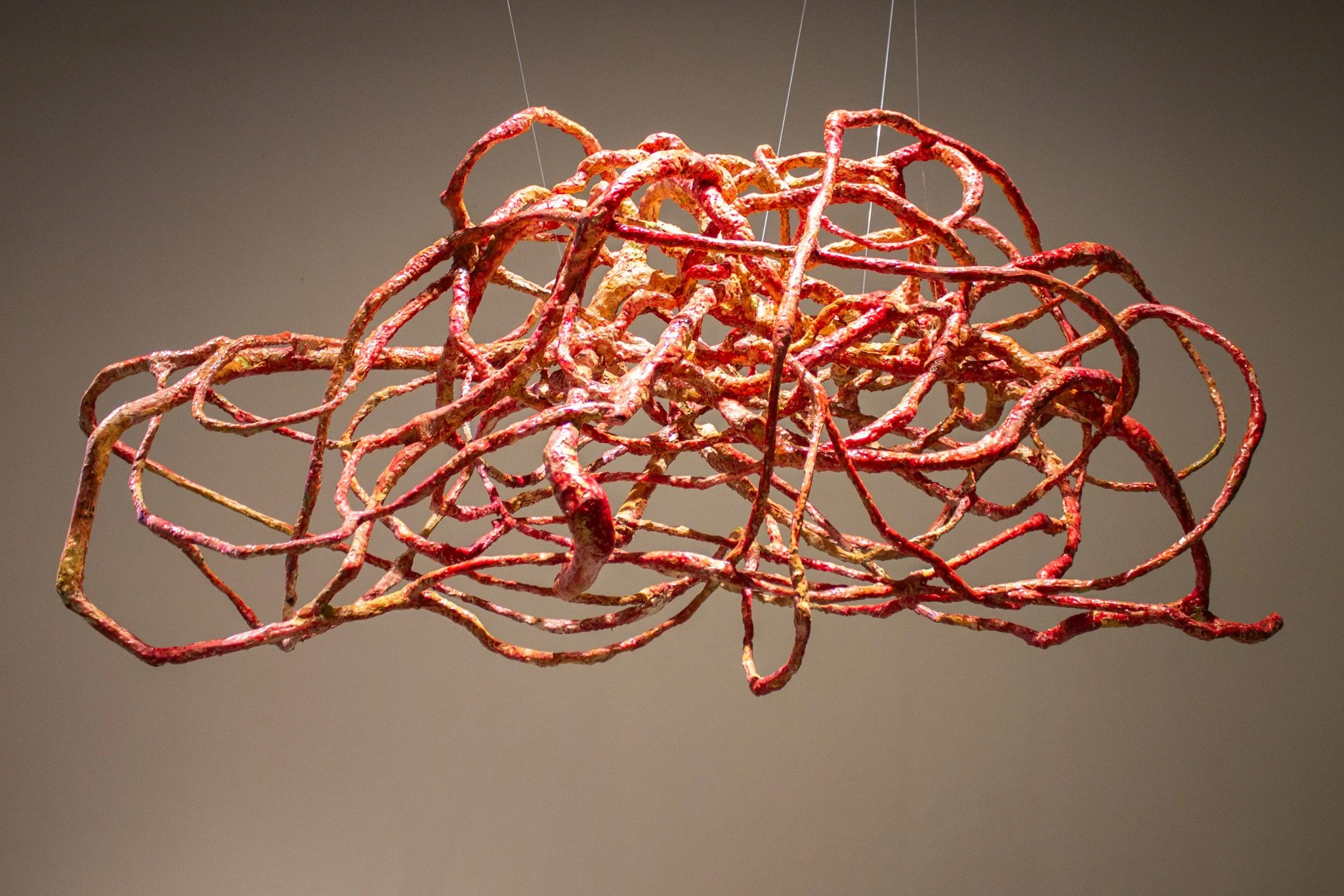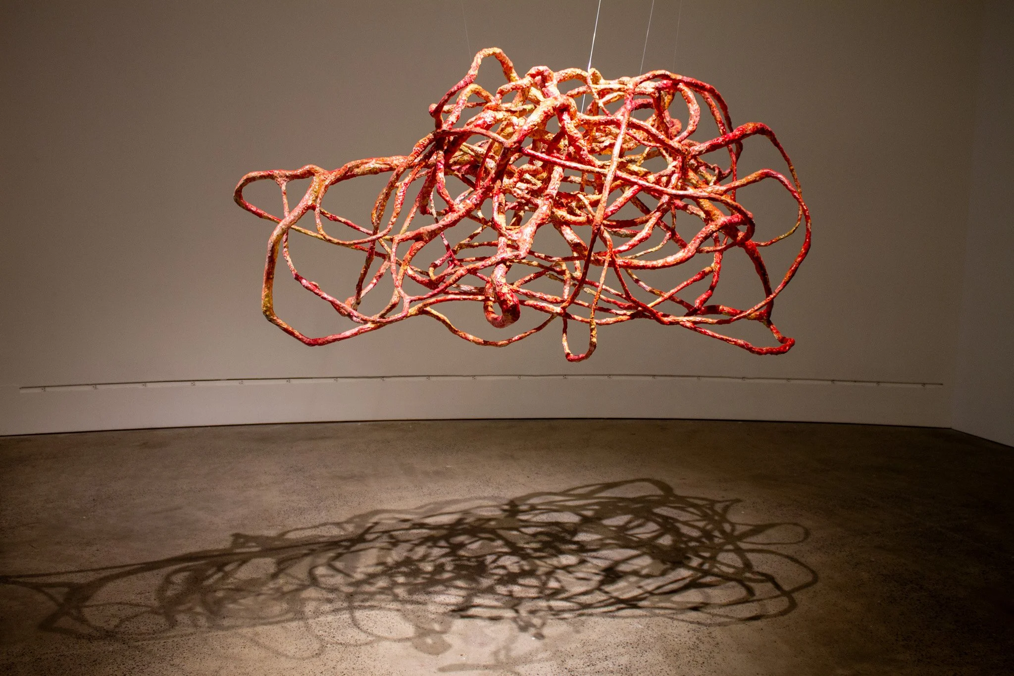 Lauren’s work traces liminal thresholds—between body and spirit, home and cosmos, birth and death. Felted wool forms like Pupa and My Tuffet, My Cloud hold imprints of bodies, recalling chrysalis, deathbed, and cloud-vehicle all at once. Her video Inner Atmos, Outer Spheres refracts childhood Sunday school songs into floating bubbles, dissonant headspaces where memory, belief, and critique converge. Across sculpture and video, she binds fallen branches, resins, and vaporous imagery into delicate networks that echo fascia, mycelium, and the web of life.